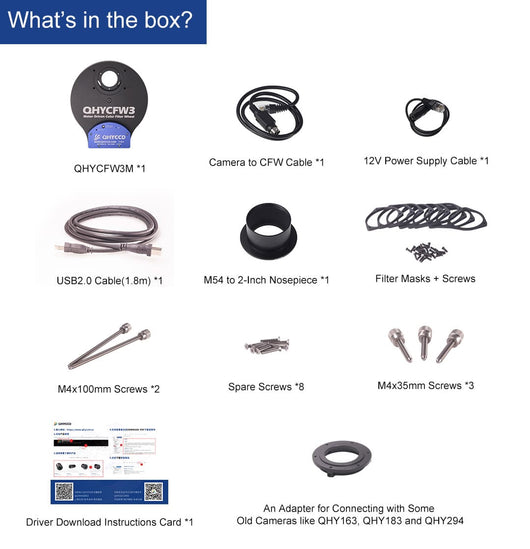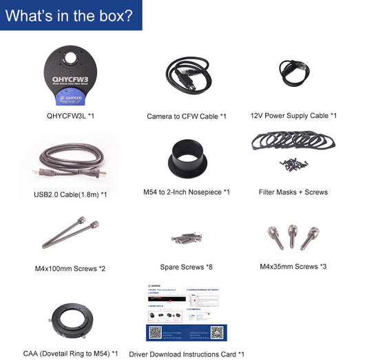 Multiple Sizes and Compatibility: The QHYCCD CFW3 series filter wheels accommodate a wide range of filter sizes from 1.25-inch up to 50 millimeters square, ensuring compatibility with various filter types for all your astrophotography needs.