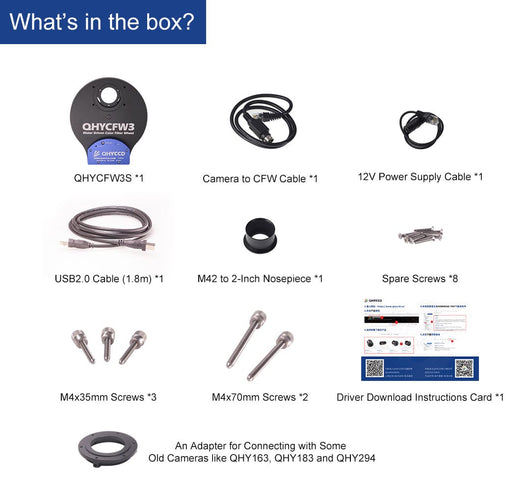 Visit the QHYCCD website for detailed back focus calculations and to view a variety of adapters available to ensure optimal compatibility and performance with your specific setup. Enhance your astrophotography experience with the QHYCCD CFW3 series filter wheels, designed for precision, efficiency, and versatility.